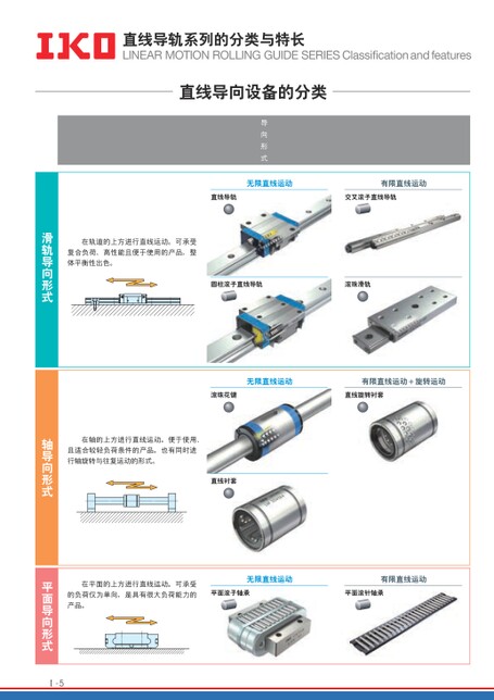 直线导轨系列的分类与特长LINEARMOTIONROLLINGGUIDESERIESClassificationandfeatures直线导向设备的分类导向形式无限直线运动有限直线运动直线导轨交叉滚子直线导轨在轨道的上方进行直线运动。可承受复合负荷、高性能且便于使用的产品,整体平衡性出色。圆柱滚子直线导轨滚珠滑轨无限直线运动有限直线运动+旋转运动滚珠花键直线旋转衬套在轴的上方进行直线运动。便于使用、且适合较轻负荷条件的产品。也有同时进行轴旋转与往复运动的形式。直线衬套在平面的上方进行直线运动。可承受无限直线运动有限直线运动的负荷仅为单向,是具有很大负荷能力的平面滚子轴承平面滚针轴承产品。滑轨导向形式轴导向形式平面导向形式Ⅰ-5