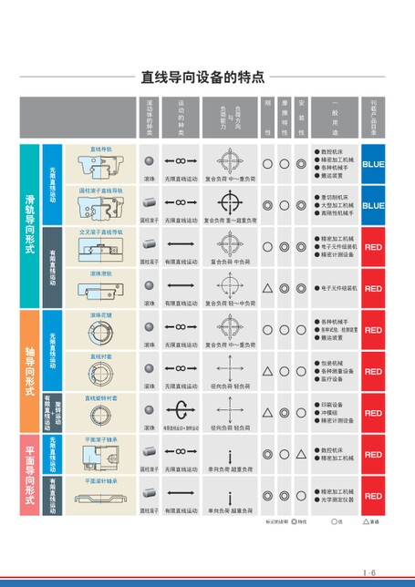 刊载产品目录刚性摩擦特性安装性一般用途负荷方向与负荷能力运动的种类滚动体的种类直线导向设备的特点直线导轨圆柱滚子直线导轨交叉滚子直线导轨滚珠滑轨滚珠花键直线衬套直线旋转衬套平面滚子轴承平面滚针轴承滚珠无限直线运动复合负荷中~重负荷圆柱滚子无限直线运动复合负荷重~超重负荷圆柱滚子有限直线运动复合负荷中负荷滚珠有限直线运动复合负荷轻~中负荷滚珠无限直线运动复合负荷中~重负荷滚珠无限直线运动径向负荷轻负荷滚珠有限直线运动+旋转运动径向负荷轻负荷圆柱滚子无限直线运动单向负荷超重负荷●数控机床●精密加工机械●各种机械手●搬运装置BLUE●重切削机床●大型加工机械●高刚性机械手BLUE●精密加工机械●电子元件组装机●精密计测设备RED●电子元件组装机RED●各种机械手●各种试验、检测装置●搬运装置RED●包装机械●各种测量设备●医疗设备RED●印刷设备●冲模组●精密计测设备RED●数控机床●精密加工机械RED●精密加工机械●光学测定仪器RED圆柱滚子有限直线运动单向负荷超重负荷标记的说明特优优普通REDⅠ-6无限直线运动有限直线运动无限直线运动旋转运动+有限直线运动无限直线运动有限直线运动滑轨导向形式轴导向形式平面导向形式