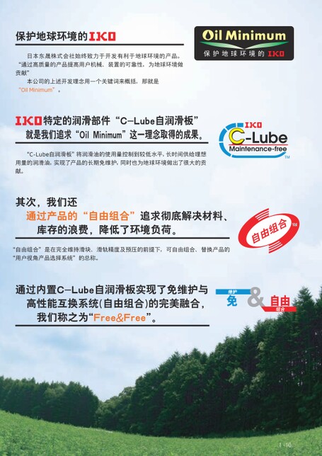 保护地球环境的日本东晟株式会社始终致力于开发有利于地球环境的产品。“通过高质量的产品提高用户机械、装置的可靠性,为地球环境做贡献”本公司的上述开发理念用一个关键词来概括,那就是“OilMinimum”。保护地球环境的特定的润滑部件“C-Lube自润滑板”就是我们追求“OilMinimum”这一理念取得的成果。“C-Lube自润滑板”将润滑油的使用量控制到较低水平,长时间供给理想用量的润滑油,实现了产品的长期免维护,同时也为地球环境做出了很大的贡献。其次,我们还通过产品的“自由组合”追求彻底解决材料、库存的浪费,降低了环境负荷。“自由组合”是在完全维持滑块、滑轨精度及预压的前提下,可自由组合、替换产品的“用户视角产品选择系统”的总称。通过内置C-Lube自润滑板实现了免维护与高性能互换系统(自由组合)的完美融合,我们称之为“Free&Free”。自由组合TMⅠ-10