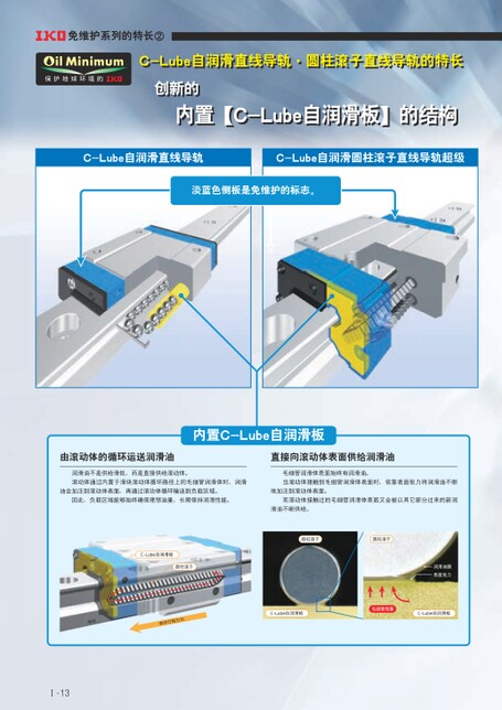 免维护系列的特长②C-Lube自润滑直线导轨·圆柱滚子直线导轨的特长C-Lube自润滑直线导轨·圆柱滚子直线导轨的特长保护地球环境的创新的创新的内置【C-Lube自润滑板】的结构内置【C-Lube自润滑板】的结构C-Lube自润滑直线导轨C-Lube自润滑圆柱滚子直线导轨超级淡蓝色侧板是免维护的标志。内置C-Lube自润滑板由滚动体的循环运送润滑油直接向滚动体表面供给润滑油润滑油不是供给滑轨,而是直接供给滚动体。毛细管润滑体表面始终有润滑油。滚动体通过内置于滑块滚动体循环路径上的毛细管润滑体时,润滑当滚动体接触到毛细管润滑体表面时,依靠表面张力将润滑油不断油会加注到滚动体表面,再通过滚动体循环输送到负载区域。地加注到滚动体表面。因此,负载区域能够始终确保理想油量,长期保持润滑性能。而滚动体接触过的毛细管润滑体表面又会被以其它部分过来的新润滑油不断供给。C-Lube自润滑板圆柱滚子圆柱滚子圆柱滚子润滑油膜表面张力滑轨滑块行程方向C-Lube自润滑板毛细管现象C-Lube自润滑板Ⅰ-13