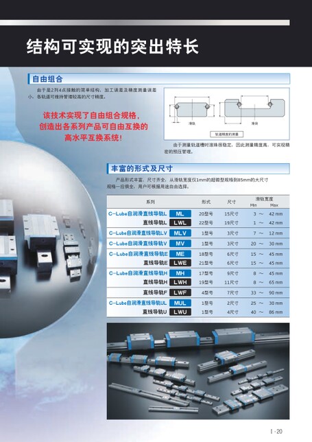 结构可实现的突出特长自由组合由于是2列4点接触的简单结构,加工误差及精度测量误差小,各轨道可维持管理较高的尺寸精度。该技术实现了自由组合规格,创造出各系列产品可自由互换的高水平互换系统!滑轨滑块轨道精度的测量由于测量轨道槽时滚珠很稳定,因此测量精度高,可实现精密的预压管理。丰富的形式及尺寸产品形式丰富、尺寸齐全,从滑轨宽度仅1mm的超微型规格到85mm的大尺寸规格一应俱全,用户可根据用途自由选择。系列形式尺寸滑轨宽度MinMaxC-Lube自润滑直线导轨L直线导轨LC-Lube自润滑直线导轨LVC-Lube自润滑直线导轨VC-Lube自润滑直线导轨EMLLWLMLVMVME直线导轨ELWEC-Lube自润滑直线导轨H直线导轨H直线导轨FC-Lube自润滑直线导轨UL直线导轨UMHLWHLWFMULLWU20型号15尺寸22型号19尺寸31~~42mm42mm1型号3尺寸7~12mm1型号3尺寸20~30mm18型号21型号6尺寸6尺寸15~45mm15~45mm17型号9尺寸19型号11尺寸88~~45mm65mm4型号7尺寸33~90mm1型号1型号2尺寸4尺寸25~30mm40~86mmⅠ-20