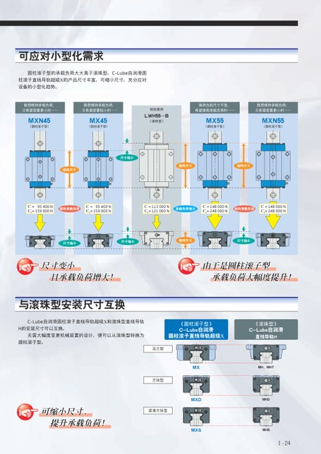 可应对小型化需求圆柱滚子型的承载负荷大大高于滚珠型。C-Lube自润滑圆柱滚子直线导轨超级X的产品尺寸丰富,可缩小尺寸,充分应对设备的小型化趋势。既想维持承载负荷,又希望装置更小时⋯⋯既想维持承载负荷,又希望装置较小时⋯⋯MXN45〈圆柱滚子型〉MX45〈圆柱滚子型〉例如使用LWH55⋯B〈滚珠型〉保持当前尺寸不变,希望提高承载负荷时⋯⋯既想维持承载负荷,又希望装置更小时⋯⋯MX55〈圆柱滚子型〉MXN55〈圆柱滚子型〉尺寸缩小相同尺寸相同尺寸相同尺寸95400NC=C0=159000N相同承载负荷95400NC=C0=159000NC=113000NC0=121000N承载负荷增大C=148000NC0=248000N相同承载负荷C=148000NC0=248000N尺寸缩小尺寸缩小相同尺寸尺寸缩小尺寸变小且承载负荷增大!由于是圆柱滚子型承载负荷大幅度提升!与滚珠型安装尺寸互换C-Lube自润滑圆柱滚子直线导轨超级X和滚珠型直线导轨H的安装尺寸可以互换。无需大幅度变更机械装置的设计,便可以从滚珠型转换为圆柱滚子型。《圆柱滚子型》C-Lube自润滑圆柱滚子直线导轨超级X《滚珠型》C-Lube自润滑直线导轨H法兰型方块型紧凑方块型MXMXDMXSMH,MHTMHDMHSⅠ-24可缩小尺寸、提升承载负荷!