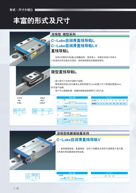 形式·尺寸介绍①丰富的形式及尺寸滚珠型微型系列C-Lube自润滑直线导轨LC-Lube自润滑直线导轨LV直线导轨L采用2列钢球与轨道4点接触结构,虽然很小,却能在承受方向和大小改变的负荷及复合负荷时,依然保持稳定的精度和刚性。微型直线导轨L超小型尺寸也有丰富的产品群。微型直线导轨L系列备有从滑轨宽度仅1mm的最小尺寸到滑轨宽度6mm的丰富产品群。用户可以根据机械·装置的规格选择理想尺寸的产品。滑块长度大小尺寸标准型1、2、3、5、7、9、12、15、20、25宽幅型2、4、6、10、14、18、24、30、42短标准C无标记高刚性加长超长GL滚珠型低断面轻量系列C-Lube自润滑直线导轨V虽然断面极低、重量极轻,但向下的额定负荷却为滚珠型产品中最大的高负荷容量直线导轨设备标准型MLLWL宽幅型MLFLWLF滑块长度标准型大小尺寸20、25、30Ⅰ-25