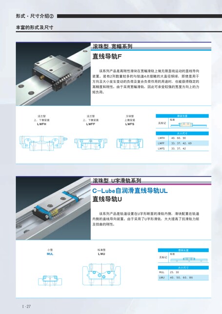 形式·尺寸介绍②丰富的形式及尺寸滚珠型宽幅系列直线导轨F该系列产品是高刚性滑块在宽幅滑轨上做无限直线运动的直线导向装置。装有2列数量较多的与轨道4点接触的大直径钢球,即使是用于方向及大小发生变动的负荷及复合负荷作用的用途时,也能获得稳定的高精度和刚性。由于采用宽幅滑轨,因此可承受较强的宽度方向上的力矩负荷。法兰型上、下侧安装LWFH法兰型上、下侧安装LWFF方块型上侧安装LWFS滑块长度标准无标记大小尺寸LWFH40、60、90LWFF33、37、42、69LWFS33、37、42滚珠型U字滑轨系列C-Lube自润滑直线导轨UL直线导轨U该系列产品是轨道设置在U字形断面的滑轨内侧,滑块配置在轨道内侧的直线导向装置。由于采用了U字形滑轨,大大提高了抗滑轨力矩及扭曲的刚性。小型MUL标准型LWU滑块长度标准无标记大小尺寸25、3040、50、60、86MULLWUⅠ-27