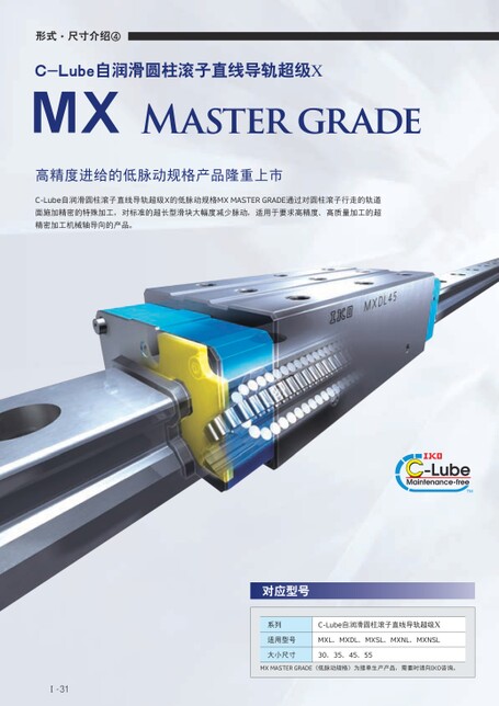 形式·尺寸介绍④C-Lube自润滑圆柱滚子直线导轨超级XMXMastergrade高精度进给的低脉动规格产品隆重上市C-Lube自润滑圆柱滚子直线导轨超级X的低脉动规格MXMASTERGRADE通过对圆柱滚子行走的轨道面施加精密的特殊加工,对标准的超长型滑块大幅度减少脉动,适用于要求高精度、高质量加工的超精密加工机械轴导向的产品。对应型号系列C-Lube自润滑圆柱滚子直线导轨超级X适用型号MXL、MXDL、MXSL、MXNL、MXNSL大小尺寸30、35、45、55MXMASTERGRADE(低脉动规格)为接单生产产品,需要时请向IKO咨询。Ⅰ-31