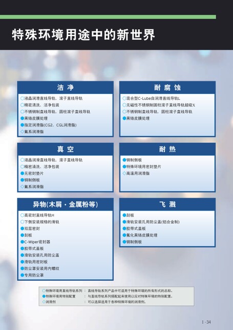 特殊环境用途中的新世界洁净耐腐蚀○液晶润滑直线导轨、滚子直线导轨○混合型C-Lube自润滑直线导轨L○精密清洗、洁净包装○无磁性不锈钢制圆柱滚子直线导轨超级X○不锈钢制直线导轨、圆柱滚子直线导轨○不锈钢制直线导轨、圆柱滚子直线导轨●黑铬皮膜处理●指定润滑脂(CG2、CGL润滑脂)◇氟系润滑脂●黑铬皮膜处理真空耐热○液晶润滑直线导轨、滚子直线导轨●钢制侧板○精密清洗、洁净包装●无密封垫片●钢制侧板◇氟系润滑脂●特殊环境用密封垫片◇高温用润滑脂异物(木屑·金属粉等)飞溅○高密封直线导轨H○下侧安装规格的滑轨●双层密封●刮板●C-Wiper密封器●胶带式盖板●滑轨安装孔用防尘盖●滑轨用密封板●防尘罩安装用内螺纹●专用防尘罩●刮板●滑轨安装孔用防尘盖(铝合金制)●胶带式盖板●氟化黑铬皮膜处理●钢制侧板○特殊环境用直线导轨系列:直线导轨系列产品中可适用于特殊环境的所有形式的总称。●特殊环境用特别配置:与直线导轨系列搭配起来使用以应对特殊环境的特别配置。◇润滑剂:可以选择适用于各种特殊环境的润滑剂。Ⅰ-34