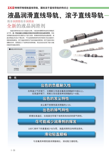 特殊环境规格直线导轨、圆柱滚子直线导轨的特点②液晶润滑直线导轨、滚子直线导轨既非润滑脂也非润滑油全新的液晶润滑剂液晶润滑剂的成分仅为液晶化合物,与基油和增稠剂构成的润滑脂完全不同,是一种由液晶化合物集合体相互形成润滑状态的全新润滑剂。传统润滑脂的基油是利用分散的分子进行润滑,很难粘附或挥发到金属表面。液晶润滑通过形成分子集合体,不仅金属表面粘附性有所提高,而且还能更大程度地抑制挥发。用于液晶润滑系列产品的液晶润滑剂是一种不仅能在滚动接触状态时,高表面压力下发挥优异润滑性能,而且还成功实现了强大功能的轴承用液晶润滑剂。■液晶润滑剂的结构相互滑动液晶分子液晶分子朝相同方向形成集合体与润滑油结构相同的碳化氢链强大的分子间作用力使分子之间不易发生脱离(挥发)润滑脂的分子状态金属表面液晶润滑剂的分子状态特长出色的负载耐久性出色的负载耐久性在常温大气环境下,长期耐久性是含氟类润滑脂的70倍以上。在高温环境下,其耐久性也是各种润滑脂的2~6倍。出色的发尘特性出色的发尘特性发尘量不到锂皂基润滑脂的1/10。出色的排气特性出色的排气特性即便在高温区,在高真空环境下依然具有良好的排气特性。尽可能减少润滑剂的挥发尽可能减少润滑剂的挥发100℃条件下的重量减少也为零。液晶润滑剂没有挥发损失。滑动轻盈顺畅滑动轻盈顺畅与含氟类和锂皂基润滑脂相比,滚动阻力值较低。Ⅰ-35