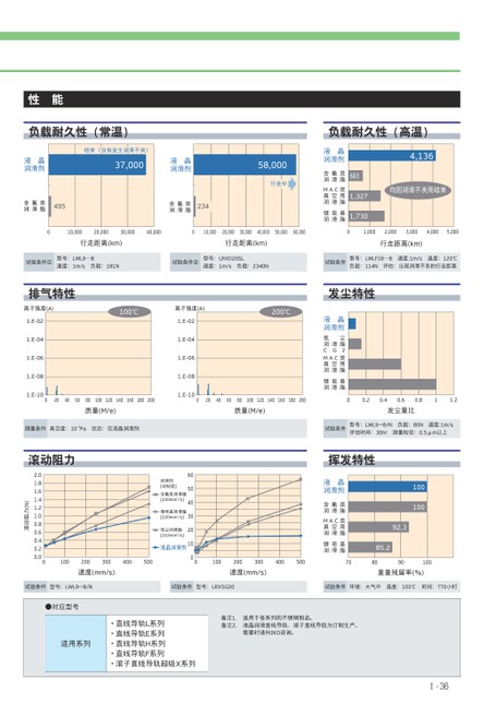 性能负载耐久性(常温)结束(没有发生润滑不良)液晶润滑剂37,000液晶润滑剂含氟类润滑脂495含氟类润滑脂23458,000行走中负载耐久性(高温)4,136均因润滑不良而结束液晶润滑剂含氟类润滑脂683MAC类真空用润滑脂锂皂基润滑脂1,3271,730010,00020,00030,00040,000010,00020,00030,00040,00050,00060,00001,0002,0003,0004,0005,000行走距离(km)行走距离(km)行走距离(km)试验条件①型号:LWL9…B速度:1m/s负载:181N试验条件②型号:LRXD20SL速度:1m/s负载:2340N试验条件型号:LWLF18…B速度:1m/s温度:120℃负载:114N评估:出现润滑不良的行走距离02040608010012014016018020000.20.40.60.811.2质量(M/e)质量(M/e)发尘量比试验条件型号:LWL9・・・B/N负载:80N速度:1m/s评估时间:30hr测量粒径:0.5μm以上挥发特性液晶润滑剂含氟类润滑脂MAC类真空用润滑脂锂皂基润滑脂10010092.385.2100200300400500708090100润滑剂[动粘度]含氟类润滑脂[220mm2/s]605040锂皂基润滑脂[220mm2/s]30低尘润滑脂[103mm2/s]液晶润滑剂20100001002003004005002.01.81.61.41.21.00.80.60.40.20.0滚动阻力(N)测量条件真空度:10-5Pa状态:仅液晶润滑剂滚动阻力速度(mm/s)速度(mm/s)重量残留率(%)试验条件型号:LWL9・・・B/N●对应型号适用系列试验条件型号:LRXSG20试验条件环境:大气中温度:100℃时间:770小时备注1.适用于各系列的不锈钢制品。备注2.液晶润滑直线导轨、滚子直线导轨为订制生产。需要时请向IKO咨询。直线导轨L系列直线导轨E系列・・・・・直线导轨H系列直线导轨F系列滚子直线导轨超级X系列Ⅰ-36排气特性离子强度(A)100℃离子强度(A)200℃1.E-021.E-041.E-061.E-081.E-100204060801001201401601802001.E-021.E-041.E-061.E-081.E-10发尘特性液晶润滑剂低尘润滑脂C2GMAC类真空用润滑脂锂皂基润滑脂