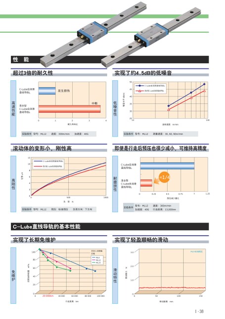 100耐久寿命比进给速度m/minC-Lube自润滑直线导轨L混合型C-Lube自润滑直线导轨L50454035302510噪音水平dB(A)低噪音性01234中断混合型C-Lube自润滑直线导轨L高速性能C-Lube自润滑直线导轨L发生损伤超过3倍的耐久性实现了约4.5dB的低噪音实验条件型号:ML12速度:300m/min加速度:40G实验条件型号:ML12测量速度:30,60,90m/min滚动体的变形小,刚性高即使是行走后预压也很少减小,可维持高精度性能约1/4C-Lube自润滑直线导轨L混合型C-Lube自润滑直线导轨L耐磨损性500负荷N1000预压减少量比00.250.50.7511.25C-Lube自润滑直线导轨L混合润C-Lube自润滑直线导轨L1210864200位移µm高刚性行走距离km移动距离mmⅠ-38ML9标准预压501001503.02.01.000滑动阻力N滑动特性未封入润滑脂空载ML9ML12ML1520000km4000060000800001000001008060402000润滑油供给量wt%免维护实验条件型号:ML12预压:标准预压负荷方向:下方向实验条件型号:ML12速度:300m/min加速度:40G行走距离:13,000kmC-Lube直线导轨的基本性能实现了长期免维护实现了轻盈顺畅的滑动