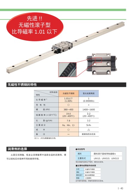 先进!!无磁性滚子型比导磁率1.01以下无磁性不锈钢的特性特性比导磁率(1)导电性材料名称无磁性不锈钢氢化硅素陶瓷1.01以下(1.005)○1(0.999991)×硬度(HV)380~4501400~1600线膨胀率(×10-6/°C)19.0(20~400°C)3.2(20~400°C)比重(g/cm)7.9主要成分成本备注Fe、Mn、Cr○━3.2Si3N4△耐腐蚀性也优良注(1)()内为测量值的示例。润滑剂的选择从真空润滑脂、低发尘润滑脂等中选择合适的润滑剂,便可以轻松应对各种不同的使用环境。●对应型号系列圆柱滚子直线导轨超级X主要形式LRX15、LRXD15、LRXS15有关详细内容和生产制作,请向IKO咨询。■主要构成零部件的材质外壳滑轨无磁性不锈钢无磁性不锈钢圆柱滚子氢化硅素陶瓷侧板工程塑料还可制作滚珠型。详细内容请向IKO咨询。Ⅰ-40