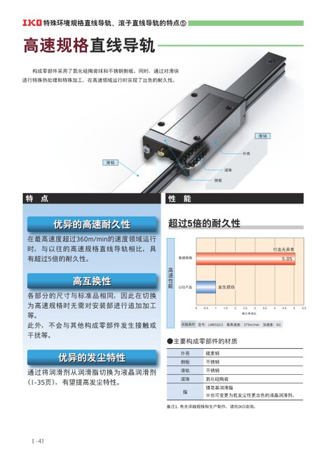 高速规格直线导轨构成零部件采用了氮化硅陶瓷球和不锈钢侧板。同时,通过对滑块进行特殊热处理和特殊加工,在高速领域运行时实现了出色的耐久性。特点性能超过5倍的耐久性优异的高速耐久性优异的高速耐久性在最高速度超过360m/min的速度领域运行时,与以往的高速规格直线导轨相比,具有超过5倍的耐久性。高互换性高互换性各部分的尺寸与标准品相同,因此在切换为高速规格时无需对安装部进行追加加工等。此外,不会与其他构成零部件发生接触或干扰等。优异的发尘特性优异的发尘特性通过将润滑剂从润滑脂切换为液晶润滑剂(I-35页),有望提高发尘特性。备注1.有关详细规格和生产制作,请向IKO咨询。试验条件型号:LWESG15最高速度:375m/min加速度:6G高速规格5.05耐久寿命比行走无异常发生损伤以往产品00.511.522.533.544.555.5●主要构成零部件的材质外壳侧板滑轨滚珠脂碳素钢不锈钢不锈钢氮化硅陶瓷锂皂基润滑脂※也可变更为低发尘性更出色的液晶润滑剂。外壳滚珠侧板滑块滑轨高速性能特殊环境规格直线导轨、滚子直线导轨的特点⑤Ⅰ-41