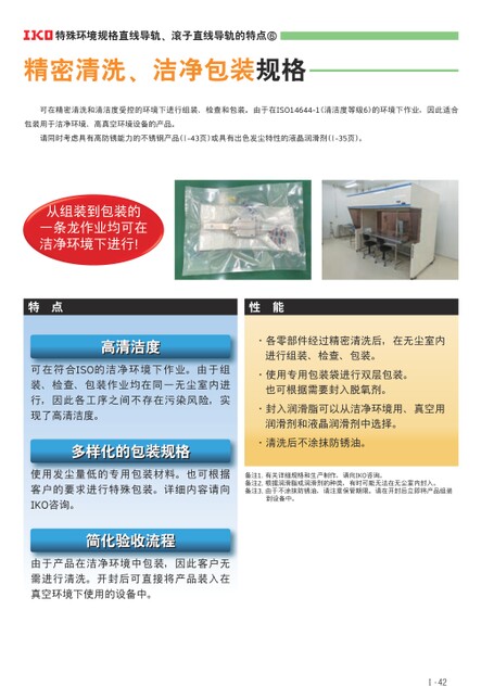 精密清洗、洁净包装规格可在精密清洗和清洁度受控的环境下进行组装、检查和包装。由于在ISO14644-1(清洁度等级6)的环境下作业,因此适合包装用于洁净环境、高真空环境设备的产品。请同时考虑具有高防锈能力的不锈钢产品(I-43页)或具有出色发尘特性的液晶润滑剂(I-35页)。特点性能高清洁度高清洁度可在符合ISO的洁净环境下作业。由于组装、检查、包装作业均在同一无尘室内进行,因此各工序之间不存在污染风险,实现了高清洁度。多样化的包装规格多样化的包装规格使用发尘量低的专用包装材料。也可根据客户的要求进行特殊包装。详细内容请向IKO咨询。简化验收流程简化验收流程由于产品在洁净环境中包装,因此客户无需进行清洗。开封后可直接将产品装入在真空环境下使用的设备中。备注1.有关详细规格和生产制作,请向IKO咨询。备注2.根据润滑脂或润滑剂的种类,有时可能无法在无尘室内封入。备注3.由于不涂抹防锈油,请注意保管期限。请在开封后立即将产品组装到设备中。·各零部件经过精密清洗后,在无尘室内进行组装、检查、包装。·使用专用包装袋进行双层包装。也可根据需要封入脱氧剂。·封入润滑脂可以从洁净环境用、真空用润滑剂和液晶润滑剂中选择。·清洗后不涂抹防锈油。特殊环境规格直线导轨、滚子直线导轨的特点⑥从组装到包装的一条龙作业均可在洁净环境下进行!Ⅰ-42