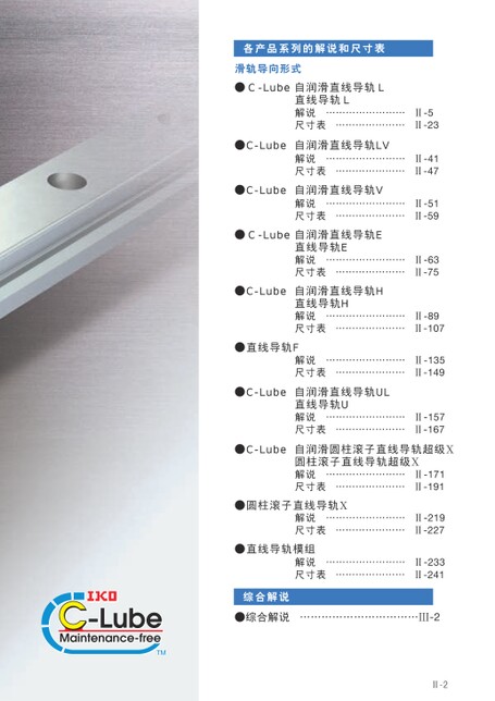 各产品系列的解说和尺寸表滑轨导向形式●C-Lube自润滑直线导轨L直线导轨L解说尺寸表⋯⋯⋯⋯⋯⋯⋯⋯⋯⋯⋯⋯⋯⋯⋯Ⅱ-5Ⅱ-23●C-Lube自润滑直线导轨LV解说尺寸表⋯⋯⋯⋯⋯⋯⋯⋯⋯⋯⋯⋯⋯⋯⋯Ⅱ-41Ⅱ-47●C-Lube自润滑直线导轨V解说尺寸表⋯⋯⋯⋯⋯⋯⋯⋯⋯⋯⋯⋯⋯⋯⋯Ⅱ-51Ⅱ-59●C-Lube自润滑直线导轨E直线导轨E解说尺寸表⋯⋯⋯⋯⋯⋯⋯⋯⋯⋯⋯⋯⋯⋯⋯●C-Lube自润滑直线导轨H直线导轨H解说尺寸表⋯⋯⋯⋯⋯⋯⋯⋯⋯⋯⋯⋯⋯⋯⋯Ⅱ-63Ⅱ-75Ⅱ-89Ⅱ-107●直线导轨F解说尺寸表⋯⋯⋯⋯⋯⋯⋯⋯⋯⋯⋯⋯⋯⋯⋯Ⅱ-135Ⅱ-149●C-Lube自润滑直线导轨UL直线导轨U解说尺寸表⋯⋯⋯⋯⋯⋯⋯⋯⋯⋯⋯⋯⋯⋯⋯Ⅱ-157Ⅱ-167●C-Lube自润滑圆柱滚子直线导轨超级X圆柱滚子直线导轨超级X解说尺寸表⋯⋯⋯⋯⋯⋯⋯⋯⋯⋯⋯⋯⋯⋯⋯Ⅱ-171Ⅱ-191●圆柱滚子直线导轨X解说尺寸表⋯⋯⋯⋯⋯⋯⋯⋯⋯⋯⋯⋯⋯⋯⋯Ⅱ-219Ⅱ-227●直线导轨模组解说尺寸表⋯⋯⋯⋯⋯⋯⋯⋯⋯⋯⋯⋯⋯⋯⋯Ⅱ-233Ⅱ-241综合解说●综合解说⋯⋯⋯⋯⋯⋯⋯⋯⋯⋯⋯Ⅲ-2Ⅱ-2