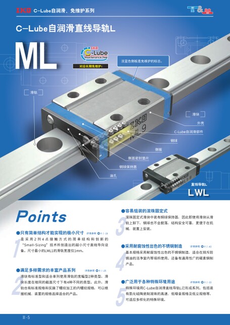 C-Lube自润滑、免维护系列C-Lube自润滑直线导轨LML对应长期免维护!淡蓝色侧板是免维护的标志。滑轨滑块外壳C-Lube自润滑部件钢球侧板侧面密封垫片钢球保持器油孔直线导轨LLWL●容易组装的滚珠固定式滚珠固定式滑块中装有钢球保持器,因此即使将滑块从滑轨上卸下,钢球也不会脱落,结构安全可靠,更便于在机械、装置上安装。●采用耐腐蚀性出色的不锈钢制造详情参照P.Ⅰ-43基本规格采用耐腐蚀性出色的不锈钢制造,适合在排斥防锈油的洁净室内等场所使用。还备有通用性广的碳素钢制产品。Points●只有简单结构才能实现的极小尺寸详情参照P.Ⅰ-19是采用2列4点接触方式的简单结构和创新的“Small-Sizing”技术所创造出的超小尺寸直线导向设备。尺寸最小的LWL1的滑轨宽度仅1mm。●满足多样需求的丰富产品系列详情参照P.Ⅰ-25滑块有标准型和适合单列使用滑轨的宽幅型2种类型,滑块长度在相同的截面尺寸下有4种不同的类型。此外,滑●广泛用于各种特殊环境用途详情参照P.Ⅰ-33轨也有标准规格和实施了螺纹加工的内螺纹规格,可以根特殊环境用C-Lube自润滑直线导轨L已形成系列。包括装据机械、装置的规格选择适合的产品。有氮化硅陶瓷制滚珠的高速、低噪音规格及低尘规格等,可适应多样化的特殊环境。Ⅱ-5