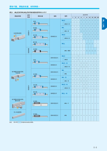 滑块个数、滑轨的长度、材料种类-表2.1ML(F)系列和LWL(F)系列标准型的型号和大小尺寸滑轨的种类材料种类滑块长度结构型号大小尺寸12357912152025MLC———○○○○○○○LWLC…B———○○○○○○○ML———○○○○○○○LWL…B———○○○○○○○MLG————○○○○○○LWLG…B————○○○○○○MLL—————○○○——LWL…BCS—————○○○○—MLC——○———————LWLC——○———————MLC…N———○○○————LWLC…N———○○○————ML——○———————LWL—○○———————ML…N———○○○————LWL…N———○○○————MLG…N————○○————LWLG…N————○○————滚珠固定式滚珠非固定式滚珠固定式滚珠非固定式滚珠固定式滚珠固定式滚珠固定式MLL…N—————○————滚珠非固定式LWL…Y○—————————滚珠非固定式LWL○—————————Ⅱ-8短型标准型加长型超长型标准型短型标准型加长型超长型标准型标准型不锈钢制碳素钢制不锈钢制标准滑轨规格有内螺纹的滑轨规格下侧安装有内螺纹的滑轨规格横向安装实心轨道规格备注表中带的备有自由组合规格。