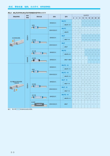 -形式、滑块长度、结构、大小尺寸、材料的种类-表2.2ML(F)系列和LWL(F)系列宽幅型的型号和大小尺寸滑轨的种类材料种类滑块长度结构型号大小尺寸246101418243042滚珠固定式滚珠非固定式滚珠固定式滚珠非固定式滚珠固定式MLFC———○○○○○○LWLFC…B———○○○○○○MLFC——○——————LWLFC——○——————MLF———○○○○○○LWLF…B———○○○○○○MLF——○——————LWLF—○○——————MLFG————○○○○○LWLFG…B————○○○○○滚珠固定式LWLF…BCS—————○○○○滚珠固定式滚珠非固定式滚珠固定式滚珠非固定式滚珠固定式MLFC…N———○○○———LWLFC…N———○○○———MLFC…N——○——————LWLFC…N——○——————MLF…N———○○○———LWLF…N———○○○———MLF…N——○——————LWLF…N——○——————MLFG…N————○○———LWLFG…N————○○———滚珠非固定式LWLF○————————短型标准型加长型标准型短型标准型加长型标准型不锈钢制碳素钢制不锈钢制标准滑轨规格有内螺纹的滑轨规格下侧安装备注表中带的备有自由组合规格。Ⅱ-9