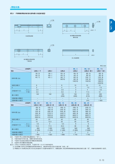 -滑轨长度-表3.1不锈钢制滑轨的标准长度和最大长度(标准型)EFL标准滑轨规格EFL有内螺纹的滑轨规格下侧安装EEn(个数)EFELWL1⋯YL有内螺纹的滑轨规格横向安装n(个数)n(个数)项目公称型号标准长度L(n)安装孔间距FEE的基准尺寸(1)最大长度(2)对接的最大根数(3)对接的最大长度(3)以上不到LWL1…Y18(30(42(3)5)7)632.55.5102--LWL118(-)30(-)42(-)----102--LWL24)32(5)40(56(7)80(10)842.56.5104(200)--L实心轨道规格LWL1ML3LWL33)30(4)40(6)60(80(8)100(10)10538150(300)--单位mm5(4)MLLWL5…B(4)7(4)MLLWL7…B(4)4)60(6)90(7)105(120(8)150(10)157.5411.5210(510)591560(4)90(6)120(8)150(10)180(12)240(16)157.54.512300(990)71905项目公称型号9(4)MLLWL9…B(4)12MLLWL12…B15MLLWL15…B20MLLWL20…B25MLLWL25…B标准长度L(n)安装孔间距FEE的基准尺寸(1)最大长度(2)对接的最大根数(3)对接的最大长度(3)以上不到3)60(4)80(6)120(8)160(220(11)280(14)20104.514.5860(1200)216604)100(6)150(200(8)275(11)350(14)475(19)2512.5517.51000(1450)219254)160(6)240(320(8)440(11)560(14)680(17)40205.525.51000(1480)218803)180(4)240(6)360(8)480(660(11)840(14)6030838960(1800)217404)240(5)300(6)360(8)480(660(11)900(15)6030939960(1800)21740不适用于带止动销的滑轨(辅助标记“/S”)。可制作到括号内的长度,需要时请向IKO咨询。不适用于自由组合规格及有内螺纹的滑轨规格。注(1)(2)(3)(4)备注1.只列出了代表性的公称型号,可适用于同一大小尺寸的所有型号。2.无论是哪个系列以及所搭配的滑块是何种形式,滑轨单件的形式标记均请注明“LWL…B”。3.两端的E尺寸如果没有注明,则为在E的基准尺寸范围内的相同尺寸。需要变更时,请注明特殊规格的指定滑轨安装孔位置“/E”。详细内容请参照Ⅲ-30页。也适用于有内螺纹的滑轨规格。Ⅱ-10