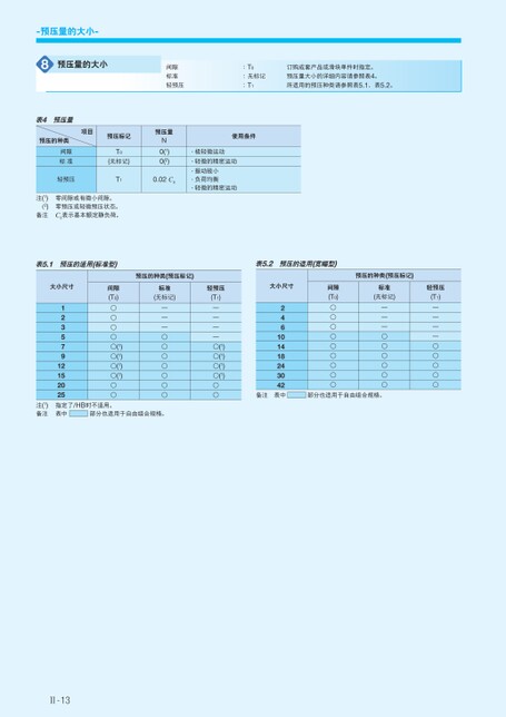 -预压量的大小-8预压量的大小间隙标准轻预压:T0:无标记:T1订购成套产品或滑块单件时指定。预压量大小的详细内容请参照表4。所适用的预压种类请参照表5.1、表5.2。表4预压量项目预压的种类间隙标准轻预压预压标记T0(无标记)预压量N0(1)0(2)T10.02C0使用条件·极轻微运动·轻微的精密运动·振动极小·负荷均衡·轻微的精密运动注(1)(2)备注零间隙或有微小间隙。零预压或轻微预压状态。C0表示基本额定静负荷。表5.1预压的适用(标准型)表5.2预压的适用(宽幅型)大小尺寸预压的种类(预压标记)间隙(T0)标准(无标记)轻预压(T1)大小尺寸246101418243042间隙(T0)○○○○○○○○○预压的种类(预压标记)标准(无标记)轻预压(T1)———○○○○○○————○○○○○备注表中部分也适用于自由组合规格。———○○○○○○○————○(1)○(1)○(1)○(1)○○○○12357912152025指定了/HB时不适用。表中○○○○○(1)○(1)○(1)○(1)注(1)备注部分也适用于自由组合规格。Ⅱ-13
