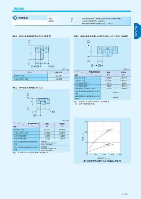 Ⅱ-14-精度等级-9精度等级高级精密级:H:P自由组合规格时,请搭配相同精度等级的滑块和滑轨。大小尺寸1的系列为“无标记”。精度等级的详细内容请参照表6.1、表6.2。表6.1容许公差及容许值(大小尺寸为1的系列)表6.2容许公差及容许值(LWLF2以外的大小尺寸为2以上的系列)CHAD1项目N2N1BD2H的尺寸公差N1及N2的尺寸公差表6.3容许公差及容许值(LWLF2)CAHD1BN1N2D2CAHDNB单位mm容许公差±0.020±0.025单位mm精密级(P)±0.010±0.0150.0070.0100.020等级(等级标记)项目H的尺寸公差N的尺寸公差H尺寸的相互差(1)N尺寸的相互差(1)多套之间H尺寸的相互差(2)相对于A面的滑块C面行走时的平行度相对于B面的滑块D面行走时的平行度高级(H)±0.020±0.0250.0150.0200.030注(1)(2)表示装入同一滑轨中的滑块之间的相互差。适用于自由组合规格。参照图1参照图1滑轨长度Lmm图1行走时的平行度(大小尺寸为2以上的系列))H(级高精密级()P50010001500200030201000平行度µm等级(等级标记)项目H的尺寸公差N1及N2的尺寸公差H尺寸的相互差(1)N尺寸的相互差(1)高级(H)±0.020±0.0250.0150.020单位mm精密级(P)±0.010±0.0150.0070.010相对于A面的滑块C面行走时的平行度相对于B面的滑块D面行走时的平行度参照图1(滑轨的长度为60mm以下时,和60mm时的值相同。)参照图1(滑轨的长度为60mm以下时,和60mm时的值相同。)注(1)表示装入同一滑轨中的滑块之间的相互差。