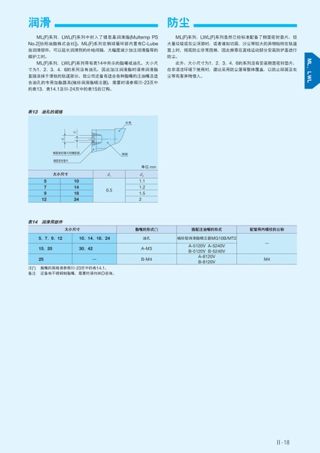Ⅱ-18润滑防尘ML(F)系列、LWL(F)系列中封入了锂皂基润滑脂(MultempPSNo.2[协同油脂株式会社])。ML(F)系列在钢球循环部内置有C-Lube自润滑部件,可以延长润滑剂的补给间隔,大幅度减少加注润滑脂等的ML(F)系列、LWL(F)系列虽然已经标准配备了侧面密封垫片,但大量垃圾或灰尘浮游时,或者诸如切屑、沙尘等较大的异物粘附在轨道面上时,彻底防尘非常困难,因此推荐在直线运动部分安装防护盖进行维护工时。防尘。ML(F)系列、LWL(F)系列带有表14中所示的脂嘴或油孔。大小尺寸为1、2、3、4、6的系列没有油孔,因此加注润滑脂时请将润滑脂直接涂抹于滑轨的轨道部分。我公司还备有适合各种脂嘴的注油嘴及适合油孔的专用加脂器具(袖珍润滑脂喷注器),需要时请参照Ⅲ-23页中的表13、表14.1及Ⅲ-24页中的表15后订购。此外,大小尺寸为1、2、3、4、6的系列没有安装侧面密封垫片,在非清洁环境下使用时,建议采用防尘罩等整体覆盖,以防止碎屑及灰尘等有害异物侵入。表14润滑用部件大小尺寸脂嘴的形式(1)搭配注油嘴的形式配管用内螺纹的公称5、7、9、1210、14、18、2415、202530、42—注(1)备注脂嘴的规格请参照Ⅲ-23页中的表14.1。还备有不锈钢制脂嘴,需要时请向IKO咨询。油孔A-M3B-M4袖珍型润滑脂喷注器MG10B/MT2A-5120VA-5240VB-5120VB-5240VA-8120VB-8120V—M4侧面密封垫片大小尺寸5791210141824d10.5单位mmd21.11.21.52外壳d1d2侧面密封垫片的橡胶部侧板表13油孔的规格