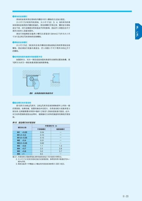 滑块的安装螺钉滑块的安装采用在滑块的内螺纹中拧入螺栓的方法加以固定。大小尺寸为1的系列的滑块,大小尺寸为2、3、4、6的系列的滑块和滑轨安装用的内螺纹是通孔。若安装螺钉拧得过深,螺柱会与滑轨发生干扰,对行走精度及寿命造成不好的影响,因此拧入深度应在尺寸表所示的拧入深度范围内。请自行准备精密设备用小螺钉(头部直径1.8mm以下)作为大小尺寸为1及LWLF2的滑块的安装螺栓。滑轨的安装螺钉大小尺寸为2、3的系列及有内螺纹的滑轨规格没有附带滑轨安装螺栓,因此请自行准备长度适当、拧入深度小于尺寸表所示的H4尺寸的螺栓。安装基准面的肩高和角部圆弧半径如图6所示,对方一侧安装基准面的角部形状推荐设置清角槽。表16所示为对方一侧安装基准面的肩高推荐值。图6安装基准面的角部形状固定螺钉的拧紧扭矩表15所示为ML(F)系列、LWL(F)系列安装到钢制部件上时的一般拧紧扭矩。如果机械、装置的振动冲击较大、负荷波动较大或者承受力矩负荷,应根据需要采用表中值的1.2倍至1.5倍的扭矩进行固定。此外,对方材料是铸铁或铝合金等时,请根据对方材料的强度特性降低拧紧扭矩。表15固定螺钉的拧紧扭矩螺钉的公称M1×0.25M1.4×0.3M1.6×0.35M2×0.4M2.5×0.45M3×0.5M4×0.7M5×0.8M6×1拧紧扭矩N·m不锈钢螺钉碳素钢螺钉0.040.100.150.310.621.12.55.08.5—————1.32.95.7—备注1.拧紧扭矩以强度等级8.8和性能类别A2-70为基准计算得出。2.大小尺寸为1的系列滑块安装孔的紧固扭矩,推荐使用表中数值的70%~80%拧紧。3.精密设备用十字槽盘头小螺丝的拧紧扭矩请参照Ⅲ-38页表22。Ⅱ-20