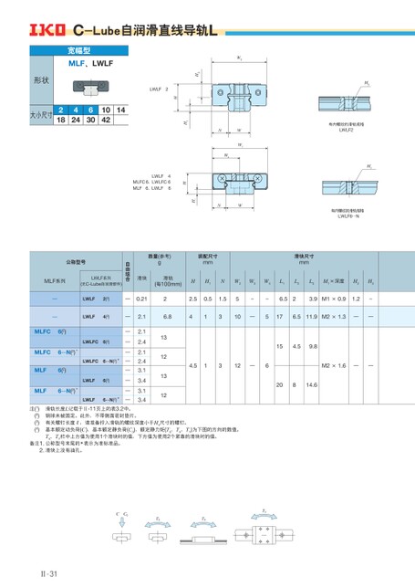 CC0TXT0TYM2M2有内螺纹的滑轨规格LWLF2有内螺纹的滑轨规格LWLF6⋯NNWH1LWLF4MLFC6、LWLFC6MLF6、LWLF6HC-Lube自润滑直线导轨LW2WW2NW4H2H1LWLF2H宽幅型MLF、LWLF形状大小尺寸218424630104214质量(参考)g装配尺寸mm滑块尺寸mm滑块滑轨(每100mm)HH1NW2W3W4L1L2L3M1×深度H2H3自由组合公称型号MLF系列LWLF系列(无C-Lube自润滑部件)——MLFC6(2)MLFC6…N(2)*MLF6(2)MLF6…N(2)*LWLF2(2)—0.2122.50.51.55--6.523.9M1×0.91.2-LWLF4(2)LWLFC6(2)LWLFC6…N(2)*LWLF6(2)LWLF6…N(2)*—————————2.12.12.42.12.43.13.43.13.46.841310—5176.511.9M2×1.3——13121312154.59.84.51312—6M2×1.6——20814.6滑轨长度L记载于Ⅱ-11页上的表3.2中。钢球未被固定。此外,不带侧面密封垫片。注(1)(2)(3)(4)有关螺钉长度R,请准备拧入滑轨的螺纹深度小于H4尺寸的螺钉。基本额定动负荷(C)、基本额定静负荷(C0)、额定静力矩(T0、TX、TY)为下图的方向的数值。TX、TY栏中上方值为使用1个滑块时的值,下方值为使用2个紧靠的滑块时的值。备注1.公称型号末尾的*表示为准标准品。2.滑块上没有油孔。Ⅱ-31
