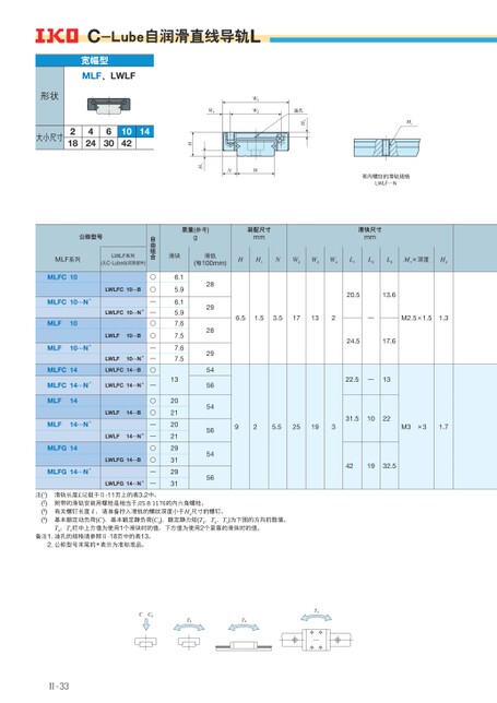 CC0TXT0TYM2H3油孔W4W2W3有内螺纹的滑轨规格LWLF⋯NNWH1宽幅型MLF、LWLF形状大小尺寸218424630104214HC-Lube自润滑直线导轨L质量(参考)g装配尺寸mm滑块尺寸mm滑块滑轨(每100mm)HH1NW2W3W4L1L2L3M1×深度H36.15.96.15.97.67.57.67.51320212021293129312829282954565456545620.513.66.51.53.517132—M2.5×1.51.324.517.622.5—1331.51022925.525193M3×31.7421932.5自由组合○○——○○——○公称型号MLF系列MLFC10MLFC10…N*MLF10MLF10…N*MLFC14LWLF系列(无C-Lube自润滑部件)LWLFC10…BLWLFC10…N*LWLF10…BLWLF10…N*LWLFC14…BMLFC14…N*LWLFC14…N*—MLF14MLF14…N*MLFG14MLFG14…N*LWLF14…BLWLF14…N*LWLFG14…BLWLFG14…N*○○——○○——滑轨长度L记载于Ⅱ-11页上的表3.2中。附带的滑轨安装用螺栓是相当于JISB1176的内六角螺栓。注(1)(2)(3)(4)有关螺钉长度R,请准备拧入滑轨的螺纹深度小于H4尺寸的螺钉。基本额定动负荷(C)、基本额定静负荷(C0)、额定静力矩(T0、TX、TY)为下图的方向的数值。TX、TY栏中上方值为使用1个滑块时的值,下方值为使用2个紧靠的滑块时的值。备注1.油孔的规格请参照Ⅱ-18页中的表13。2.公称型号末尾的*表示为准标准品。Ⅱ-33