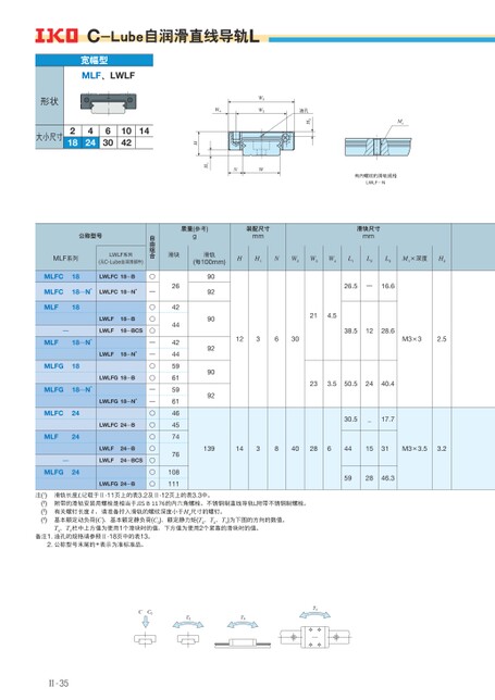 CC0TXT0TYM2H3油孔W4W2W3有内螺纹的滑轨规格LWLF⋯NNWH1宽幅型MLF、LWLF形状大小尺寸218424630104214HC-Lube自润滑直线导轨L质量(参考)g装配尺寸mm滑块尺寸mm滑块滑轨(每100mm)HH1NW2W3W4L1L2L3M1×深度H390929092909226.5—16.6214.5123630M3×32.538.51228.6233.550.52440.430.5_17.7139143840286441531M3×3.53.2592846.326424442445961596146457476108111自由组合○—○○○——○○——○○○○○○○公称型号MLF系列LWLF系列(无C-Lube自润滑部件)MLFC18LWLFC18…BMLFC18…N*LWLFC18…N*MLF18LWLF18…B—LWLF18…BCSMLF18…N*MLFG18MLFG18…N*MLFC24MLF24LWLF18…N*LWLFG18…BLWLFG18…N*LWLFC24…BLWLF24…B—LWLF24…BCSMLFG24LWLFG24…B滑轨长度L记载于Ⅱ-11页上的表3.2及Ⅱ-12页上的表3.3中。附带的滑轨安装用螺栓是相当于JISB1176的内六角螺栓。不锈钢制直线导轨L附带不锈钢制螺栓。有关螺钉长度R,请准备拧入滑轨的螺纹深度小于H4尺寸的螺钉。基本额定动负荷(C)、基本额定静负荷(C0)、额定静力矩(T0、TX、TY)为下图的方向的数值。TX、TY栏中上方值为使用1个滑块时的值,下方值为使用2个紧靠的滑块时的值。备注1.油孔的规格请参照Ⅱ-18页中的表13。2.公称型号末尾的*表示为准标准品。注(1)(2)(3)(4)Ⅱ-35