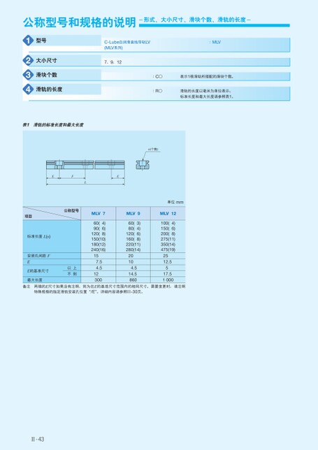 公称型号和规格的说明-形式、大小尺寸、滑块个数、滑轨的长度-1234型号大小尺寸滑块个数滑轨的长度表1滑轨的标准长度和最大长度C-Lube自润滑直线导轨LV(MLV系列)7、9、12:MLV:C○:R○表示1根滑轨所搭配的滑块个数。滑轨的长度以毫米为单位表示。标准长度和最大长度请参照表1。n(个数)EFEL项目公称型号标准长度L(n)安装孔间距FEE的基准尺寸最大长度以上不到MLV74)60(6)90(120(8)150(10)180(12)240(16)157.54.512300MLV93)60(4)80(6)120(160(8)220(11)280(14)20104.514.5860单位mmMLV124)100(6)150(200(8)275(11)350(14)475(19)2512.5517.51000备注两端的E尺寸如果没有注明,则为在E的基准尺寸范围内的相同尺寸。需要变更时,请注明特殊规格的指定滑轨安装孔位置“/E”。详细内容请参照Ⅲ-30页。Ⅱ-43