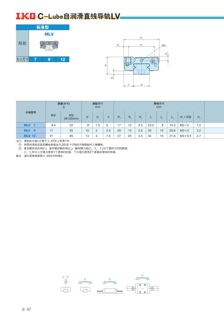 质量(参考)g装配尺寸mm滑块尺寸mm公称型号MLVMLV79MLV12滑块8.41731滑轨(每100mm)223565H81013H11.523N55.57.5W2172027W3121520W42.52.53.5L123.53034L281015L3M1×深度14.320.821.6M2×2M3×3M3×3.5H31.52.22.7H3油孔W4W2W3NWH1H标准型MLV形状大小尺寸7912C-Lube自润滑直线导轨LV注(1)滑轨的长度L记载于Ⅱ-43页上的表1中。(2)附带的滑轨安装用螺栓是相当于JISB1176的不锈钢制内六角螺栓。(3)基本额定动负荷(C)、基本额定静负荷(C0)、额定静力矩(T0、TX、TY)为下图的方向的数值。TX、TY栏中上方值为使用1个滑块时的值,下方值为使用2个紧靠的滑块时的值。备注油孔规格请参照Ⅱ-45页中的表5。CC0T0TXTYⅡ-47