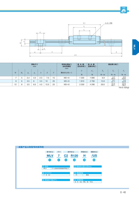 MLVCAD(L1)L3L24-M1×深度E额定静力矩(3)额本基定动负荷(3)额本基定静负荷(3)d3EFL(1)d4hH4滑轨尺寸mm附带的滑轨(2)安装用螺栓mmW7912H4568d32.43.53.5d44.266.5hE2.33.54.57.51012.5F152025螺丝的公称×RM2×6M3×8M3×8CN133018103330C0N189027604290T0N·m6.912.826.6TXN·m4.728.29.151.115.493.1TYN·m3.923.67.642.912.978.21N≈0.102kgf成套产品公称型号的排列例型号标记尺寸部件标记等级标记辅助标记MLV172C2R12034H5/US6C-Lube自润滑直线导轨LV4滑轨的长度(120mm)型号1MLV大小尺寸27、9、123滑块的个数(2个)5精度等级H高级特殊规格6D、E、US、MN、W、YCGⅡ-48