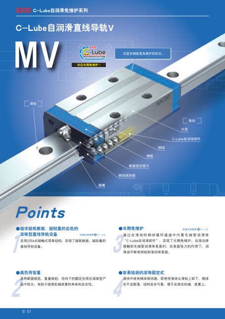 C-Lube自润滑免维护系列C-Lube自润滑直线导轨VMV淡蓝色侧板是免维护的标志。对应长期免维护!滑轨滑块外壳C-Lube自润滑部件钢球侧板侧面密封垫片钢球保持器脂嘴Points●追求超低断面、超轻量的出色的滚珠型直线导轨设备●长期免维护详细内容参照P.Ⅰ-11详细内容参照P.Ⅰ-19通过在滑块的钢球循环通道中内置毛细管润滑体采用2列4点接触式简单结构,实现了超低断面、超轻量的“C-Lube自润滑部件”,实现了长期免维护。当滚动体直线导轨设备。接触到毛细管润滑体表面时,在表面张力的作用下,润滑油不断地供给到滚动体表面。●高负荷容量●容易组装的滚珠固定式虽然断面极低、重量极轻,但向下的额定负荷在滚珠型产滑块中装有钢球保持器,即使将滑块从滑轨上卸下,钢球品中较大,有助于提高机械装置的寿命和安全性。也不会脱落,结构安全可靠,便于安装在机械、装置上。Ⅱ-51