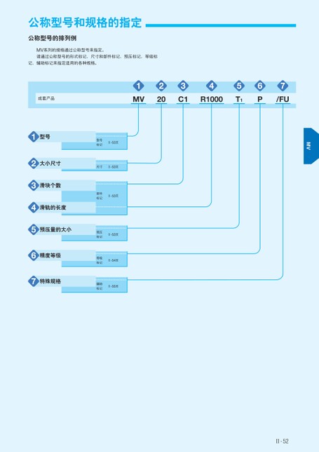MV公称型号和规格的指定公称型号的排列例MV系列的规格通过公称型号来指定。请通过公称型号的形式标记、尺寸和部件标记、预压标记、等级标记、辅助标记来指定适用的各种规格。1MV2203C14R10005T16P7/FU成套产品1型号2大小尺寸3滑块个数4567滑轨的长度预压量的大小精度等级特殊规格型号标记Ⅱ-53页尺寸Ⅱ-53页部件标记Ⅱ-53页预压标记Ⅱ-53页等级标记Ⅱ-54页辅助标记Ⅱ-55页Ⅱ-52