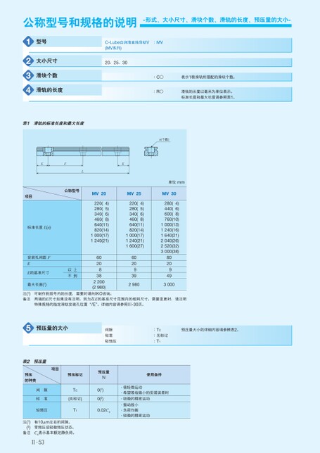 公称型号和规格的说明-形式、大小尺寸、滑块个数、滑轨的长度、预压量的大小-1234型号大小尺寸滑块个数滑轨的长度表1滑轨的标准长度和最大长度C-Lube自润滑直线导轨V(MV系列):MV20、25、30:C○:R○表示1根滑轨所搭配的滑块个数。滑轨的长度以毫米为单位表示。标准长度和最大长度请参照表1。EFEL公称型号以上不到MV204)220(5)280(6)340(460(8)640(11)820(14)1000(17)1240(21)60208382200(2980)项目标准长度L(n)安装孔间距FEE的基准尺寸最大长度(1)n(个数)单位mmMV304)280(6)440(600(8)760(10)1000(13)1240(16)1640(21)2040(26)2520(32)3000(38)8020949MV254)220(5)280(6)340(460(8)640(11)820(14)1000(17)1240(21)1600(27)602093929803000注(1)可制作到括号内的长度,需要时请向IKO咨询。备注两端的E尺寸如果没有注明,则为在E的基准尺寸范围内的相同尺寸。需要变更时,请注明特殊规格的指定滑轨安装孔位置“/E”。详细内容请参照Ⅲ-30页。5预压量的大小间隙标准轻预压:TC:无标记:T1预压量大小的详细内容请参照表2。表2预压量项目预压的种类间隙标准轻预压预压标记TC(无标记)预压量N0(1)0(2)T10.02C0使用条件·极轻微运动·希望吸收微小的安装误差时·轻微的精密运动·振动极小·负荷均衡·轻微的精密运动注(1)有10μm左右的间隙。(2)零预压或轻微预压状态。备注C0表示基本额定静负荷。Ⅱ-53