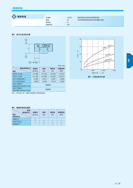 )H级(高、级通普精密级()P超精密级()PS100020003000滑轨的长度Lmm图1行走时的平行度4030201000平行度μmⅡ-54普通级高级精密级超精密级:无标记:H:P:SP精度等级的详细内容请参照表3。适用的精度等级和预压种类搭配见表4。-精度等级-6精度等级表3容许公差及容许值CAHNBD等级(等级标记)项目H的尺寸公差N的尺寸公差H尺寸的相互差(1)N尺寸的相互差(1)相对于A面的滑块C面行走时的平行度相对于B面的滑块D面行走时的平行度单位mm普通级(无标记)±0.080±0.1000.0250.030高级(H)±0.040±0.0500.0150.020精密级超精密级(P)±0.020±0.0250.0070.010(SP)±0.010±0.0150.0050.007根据图1根据图1注(1)表示装入同一滑轨中的滑块之间的相互差。表4精度和预压的搭配等级(等级标记)项目(预压标记)间隙(TC)标准(无标记)轻预压(T1)普通级(无标记)高级(H)○○--○○精密级超精密级(P)-○○(SP)-○○