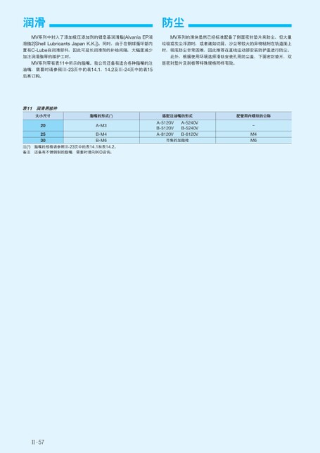 润滑防尘MV系列中封入了添加极压添加剂的锂皂基润滑脂(AlvaniaEP润滑脂2[ShellLubricantsJapanK.K.])。同时,由于在钢球循环部内置有C-Lube自润滑部件,因此可延长润滑剂的补给间隔,大幅度减少加注润滑脂等的维护工时。MV系列带有表11中所示的脂嘴。我公司还备有适合各种脂嘴的注油嘴,需要时请参照Ⅲ-23页中的表14.1、14.2及Ⅲ-24页中的表15后再订购。MV系列的滑块虽然已经标准配备了侧面密封垫片来防尘,但大量垃圾或灰尘浮游时,或者诸如切屑、沙尘等较大的异物粘附在轨道面上时,彻底防尘非常困难,因此推荐在直线运动部安装防护盖进行防尘。此外,根据使用环境选择滑轨安装孔用防尘盖、下面密封垫片、双层密封垫片及刮板等特殊规格同样有效。表11润滑用部件大小尺寸202530脂嘴的形式(1)A-M3B-M4B-M6搭配注油嘴的形式A-5120VA-5240VB-5120VB-5240VA-8120VB-8120V市售的加脂枪配管用内螺纹的公称-M4M6注(1)脂嘴的规格请参照Ⅲ-23页中的表14.1和表14.2。备注还备有不锈钢制的脂嘴,需要时请向IKO咨询。Ⅱ-57