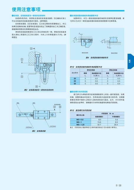使用注意事项安装面、安装基准面及一般性的安装结构安装基准面的肩高和角部圆弧半径安装MV系列时,将滑轨及滑块的安装基准面B、D正确地对准工如图4所示,对方一侧安装基准面的角部形状推荐设置清角槽。表作台及底座的安装基准面进行固定。(参照图2)12所示为对方一侧安装基准面的肩高和角部圆弧半径推荐值。安装基准面B、D及安装面A、C已经过精密的研磨精加工。所以如果安装侧的机械、装置等的安装面也经过了高精度的加工并正确安装,就能够获得稳定的高精度直线运动。R2R2h2滑块安装部滑轨安装部图4安装基准面的角部形状R1R1h1表12安装基准面的肩高和角部圆弧半径滑块安装部滑轨安装部大小尺寸肩高角部圆弧半径肩高角部圆弧半径202530h1555R1(最大)0.20.50.5h2333R2(最大)0.50.50.5固定螺钉的拧紧扭矩表13所示为将MV系列安装到钢制部件上时的一般拧紧扭矩。如果机械、装置的振动冲击较大、负荷波动较大或者承受力矩负荷,应根据需要采用表中值的1.2倍至1.5倍的扭矩进行固定。此外,对方材料是铸铁或铝合金等时,请根据对方材料的强度特性降低拧紧扭矩。表13固定螺钉的拧紧扭矩螺钉的公称拧紧扭矩N·m碳素钢螺钉不锈钢螺钉滑块的安装基准面是有标记的相反的一侧。滑轨的安装基准标记看时,为其上方的侧面(箭头方向)。(参面从滑轨上表面的照图3)DCAB图2安装基准面及一般性的安装结构滑轨滑块安装基准面DB标记图3安装基准面标记备注M5×0.8M6×1M8×1.255.08.520.4拧紧扭矩以强度等级12.9和性能类别A2-70为基准计算得出。8.013.632.7Ⅱ-58