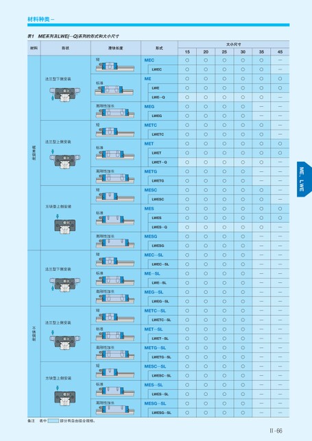 材料种类-表1ME系列及LWE(…Q)系列的形式和大小尺寸材料形状滑块长度形式大小尺寸152025303545MECLWECMELWELWE…QMEGLWEGMETCLWETCMETLWETLWET…QMETGLWETGMESCLWESCMESLWESLWES…QMESGLWESGMEC…SLLWEC…SLME…SLLWE…SLMEG…SLLWEG…SLMETC…SLLWETC…SLMET…SLLWET…SLMETG…SLLWETG…SLMESC…SLLWESC…SLMES…SLLWES…SLMESG…SLLWESG…SL○○○○○○○○○○○○○○○○○○○○○○○○○○○○○○○○○○○○○○○○○○○○○○○○○○○○○○○○○○○○○○○○○○○○○○○○○○○○○○○○○○○○○○○○○○○○○○○○○○○○○○○○○○○○○○○○○○○○○○○○○○○○○○○○○○○○○○○○○○○○○○○○○○○○○○○○○○○○○○○○○——○○○○○——○○○○○——————————————————————○○—————○○—————○○—————————————————————短标准高刚性加长短标准高刚性加长短标准高刚性加长短标准高刚性加长短标准高刚性加长短标准高刚性加长法兰型下侧安装法兰型上侧安装方块型上侧安装法兰型下侧安装法兰型上侧安装方块型上侧安装碳素钢制不锈钢制备注表中部分有自由组合规格。Ⅱ-66