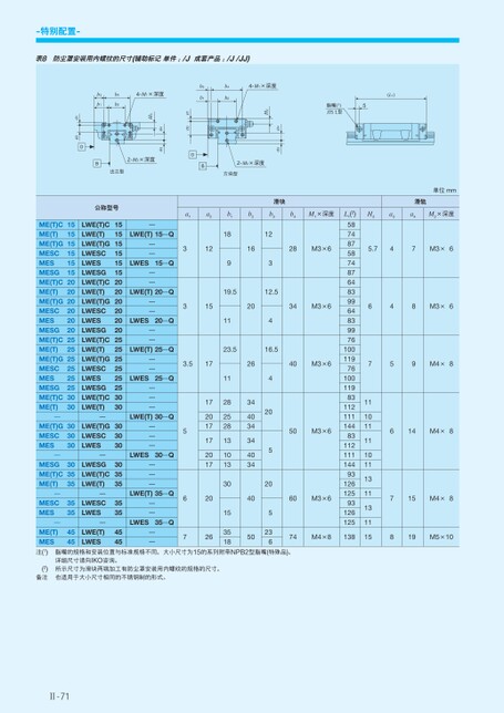 单位mm滑轨H3a3a4M2×深度5.747M3×6648M3×6759M4×81110111110111311131115614M4×87815M4×819M5×10L1(2)587487587487648399648399761001197610011983112111144831121111449312612593126125138公称型号LWE(T)CLWE(T)LWE(T)GLWESCLWESLWESGLWE(T)CLWE(T)LWE(T)GLWESCLWESLWESGLWE(T)CLWE(T)LWE(T)GLWESCLWESLWESGLWE(T)CLWE(T)—LWE(T)GLWESCLWES—LWESGLWE(T)CLWE(T)—LWESCLWES15151515151520202020202025252525252530303030303035353535ME(T)CME(T)ME(T)GMESCMESMESGME(T)CME(T)ME(T)GMESCMESMESGME(T)CME(T)ME(T)GMESCMESMESGME(T)CME(T)—ME(T)GMESCMES—MESGME(T)CME(T)—MESCMES15151515151520202020202025252525252530303030303035353535a1a2b1b2b3b4M1×深度滑块—LWE(T)15…Q——312LWES15…Q——1891612328M3×6LWE(T)20…Q19.512.5——3152034M3×6LWES20…Q114——LWE(T)25…Q23.516.5——3.517LWES25…Q———LWE(T)30…Q———5LWES30…Q———172017172017LWE(T)35…Q——6201128252813101330152634403434403440420520540M3×650M3×660M3×6LWES35…Q4545—LWE(T)LWES—ME(T)MES脂嘴的规格和安装位置与标准规格不同。大小尺寸为15的系列附带NPB2型脂嘴(特殊品)。详细尺寸请向IKO咨询。所示尺寸为滑块两端加工有防尘罩安装用内螺纹的规格的尺寸。45453518236——也适用于大小尺寸相同的不锈钢制的形式。7265074M4×8注(1)(2)备注Ⅱ-71(L1)脂嘴(1)JIS1型5b3b1b4b24-M1×深度b3b1b4b24-M1×深度a4a3H32-M2×深度方块型DBa1a2a4a3H32-M2×深度B法兰型Da1a2-特别配置-表8防尘罩安装用内螺纹的尺寸(辅助标记单件:/J成套产品:/J/JJ)