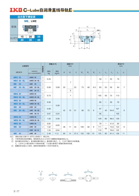 CC0TXT0TY脂嘴(4)H3W2W3W4H2HNWH1质量(参考)装配尺寸mm滑轨kg/m滑块kg0.33HH1NW2W3W4L159滑块尺寸mmL2—L3L4d132700.563.09332573606.58335569477670.730.580.990.971.500.841.521.532.465.095.045.096.856.8411.242103190729481133100829601437.512010010102507511368—367897964064.81071061296096.513978111110125—506041.674.676.681.4901231221369911法兰型下侧安装ME、LWE形状大小尺寸153020352545自由组合○○○○—○○○○○○—○○○○—○公称型号ME系列LWE系列(无C-Lube自润滑部件)MEC25LWEC25MEC25…SLLWEC25…SLMEME25LWE2525…SLLWE25…SL—MEG25LWE25…QLWEG25MEG25…SLLWEG25…SLMEC30LWEC30MEC30…SLLWEC30…SLMEME30LWE3030…SLLWE30…SL—MEG30LWE30…QLWEG30MEG30…SLLWEG30…SLMEC35ME35—ME45LWEC35LWE35LWE35…QLWE45C-Lube自润滑直线导轨E注(1)(2)(3)(4)滑轨长度L记载于Ⅱ-67页上的表2.1、表2.2中。不附带滑轨安装用螺栓。推荐使用JISB1176内六角螺栓的强度类别12.9。基本额定动负荷(C)、基本额定静负荷(C0)、额定静力矩(T0、TX、TY)为下图的方向的数值。TX、TY栏中上方值为使用1个滑块时的值,下方值为使用2个紧靠的滑块时的值。脂嘴的形状因大小而异。规格详情请参照Ⅱ-73页中的表15。Ⅱ-77