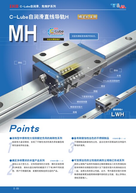 C-Lube自润滑、免维护系列MHC-Lube自润滑直线导轨H精密机床用对应长期免维护!淡蓝色侧板是免维护的标志。滑轨滑块外壳C-Lube自润滑部件钢球侧板下面密封垫片钢球保持器侧面密封垫片脂嘴直线导轨HLWHPoints●滚珠型中拥有较大级别额定负荷的高刚性系列●备有耐腐蚀性出色的不锈钢制品详情参照P.Ⅰ-43组装有大直径钢球,实现了平衡性良好的高负荷容量型高不锈钢制品耐腐蚀性出色,适合在排斥防锈油的洁净室内刚性直线导轨设备。等场所使用。●满足多样需求的丰富产品系列详情参照P.Ⅰ-26●可发挥出色防尘性能的高防尘规格已形成系列滑块以法兰型为主,还有宽度窄的方块型、横向安装型等高防尘规格产品将所有面经过精密磨削加工的专用滑轨和共5种类型,滑块长度在相同的截面尺寸下有3种不同的类装有特殊形状侧面密封垫片及下面密封垫片的滑块组合在型,用户可根据机械、装置的规格选择合适的产品。一起,发挥出色的防尘性能。此外,带内面密封垫片的特殊规格能够更加提高钢球循环部的防尘性能,阻止异物从滑轨顶面侵入。Ⅱ-89