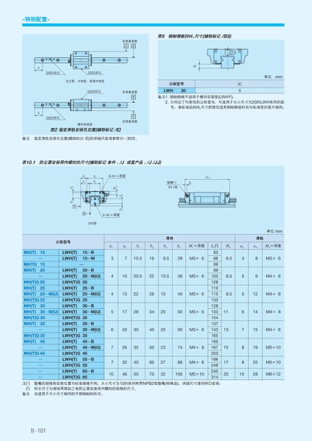 单位mm公称型号LWH20H15备注1.钢制侧板不适用于横向安装型(LWHY)。2.只列出了代表性的公称型号,可适用于大小尺寸为20的LWH系列的型号。准标准品的H1尺寸即使在适用钢制侧板时也与标准密封垫片相同。H1EE标记标记法兰型、方块型、紧凑方块型标记安装基准面BD安装基准面标记横向安装型图2指定滑轨安装孔位置(辅助标记/E)备注指定滑轨安装孔位置(辅助标记/E)的详细内容请参照Ⅲ-30页。-特别配置-表9钢制侧板的H1尺寸(辅助标记/BS)安装基准面DB(L1)脂嘴(1)JIS1型5a4a3H34-M1×深度b4b22-M2×深度法兰型b3b1Ba1Da2表10.1防尘罩安装用内螺纹的尺寸(辅助标记单件:/J成套产品:/J/JJ)公称型号LWH(T)LWH(T)15…B15…M—MH(T)MHTGMH(T)15—1520—MH(T)G2025MH(T)MH(T)25…M(U)MH(T)G25MH(T)3030…M(U)MH(T)MH(T)G30MH(T)35—MH(T)G35MH(T)45—MH(T)G45————LWH(T)LWH(T)LWH(T)G20LWH(T)LWH(T)LWH(T)G25LWH(T)LWH(T)LWH(T)G30LWH(T)LWH(T)LWH(T)G35LWH(T)LWH(T)LWH(T)G45LWH(T)LWH(T)G55LWH(T)LWH(T)G6520…B20…M(U)25…B25…M(U)30…B30…M(U)35…B35…M(U)45…B45…M(U)55…B65…B滑块a2b1b2b3b4M1×深度715.5169.528M3×6a1341020.52213.536M3×641322261540M3×651728342050M3×662030402060M3×672635502374M4×8710324640506070273286M4×8106M5×10单位mm滑轨H3a36.54a48M2×深度M3×68.559M4×88.5512M4×811614M4×813715M4×8151720819M5×108102528M5×10M6×12L1(2)83869999103128110115133128133154137143165160167203196248240314注(1)(2)备注脂嘴的规格和安装位置与标准规格不同。大小尺寸为15的系列附带NPB2型脂嘴(特殊品)。详细尺寸请向IKO咨询。所示尺寸为滑块两端加工有防尘罩安装用内螺纹的规格的尺寸。也适用于大小尺寸相同的不锈钢制的形式。Ⅱ-101