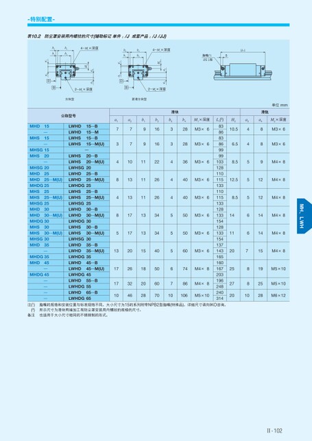 MHSMHD15—15—MHSG1520MHS—MHSG20MHD25MHD25…M(U)MHDG2525MHSMHS25…M(U)MHSG2530MHDMHD30…M(U)MHDG30MHS30MHS30…M(U)MHSG30MHD35—MHDG35MHD45—MHDG45————公称型号LWHDLWHDLWHSLWHSLWHSLWHSLWHSG20LWHDLWHDLWHDG25LWHSLWHSLWHSG25LWHDLWHDLWHDG30LWHSLWHSLWHSG30LWHDLWHDLWHDG35LWHDLWHDLWHDG45LWHDLWHDG55LWHDLWHDG65滑块a17a27b19b216b33b4M1×深度28M3×637916328M3×64101122436M3×68131126440M3×64131126440M3×68171334550M3×65171334550M3×613201540560M3×617261850674M4×8171032462028607071086M4×8106M5×10单位mm滑轨H310.5a34a48M2×深度M3×66.548M3×68.559M4×812.5512M4×88.5512M4×814614M4×811614M4×820715M4×8252720819M5×108102528M5×10M6×12L1(2)83868386999910312811011513311011513312813315412813315413714316516016720319624824031415…B15…M15…B15…M(U)—20…B20…M(U)25…B25…M(U)25…B25…M(U)30…B30…M(U)30…B30…M(U)35…B35…M(U)45…B45…M(U)55…B65…B注(1)(2)备注脂嘴的规格和安装位置与标准规格不同。大小尺寸为15的系列附带NPB2型脂嘴(特殊品)。详细尺寸请向IKO咨询。所示尺寸为滑块两端加工有防尘罩安装用内螺纹的规格的尺寸。也适用于大小尺寸相同的不锈钢制的形式。Ⅱ-102(L1)脂嘴(1)JIS1型5b4b24-M1×深度b3b1b4b24-M1×深度a4a3H3a1Da2a4a3H32-M2×深度B2-M2×深度方块型紧凑方块型b3b1Ba1Da2表10.2防尘罩安装用内螺纹的尺寸(辅助标记单件:/J成套产品:/J/JJ)-特别配置-