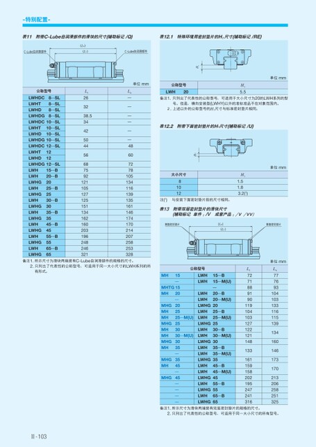 单位mm公称型号LWH20H15.5备注1.只列出了代表性的公称型号,可适用于大小尺寸为20的LWH系列的型号。但是,横向安装型(LWHY)以外的准标准品不在对象范围内。2.上述以外的公称型号的H1尺寸与标准密封垫片相同。H1表12.2附带下面密封垫片的H1尺寸(辅助标记/U)单位mmH11.51.83.2(1)H1大小尺寸81012注(1)与安装下面密封垫片前的尺寸相同。表13附带双层密封垫片的滑块尺寸(辅助标记单件:/V成套产品:/V/VV)侧面密封垫片(L4)(L1)侧面密封垫片单位mmL4——————48607278105134116139135161146174170214207258253328L1263238.53442504456687592121105127125151134162160203196248246321公称型号12128…SLLWHDC8…SLLWHT8…SLLWHDLWHDG8…SLLWHDC10…SL10…SLLWHTLWHD10…SLLWHDG10…SLLWHDC12…SLLWHTLWHDLWHDG12…SLLWHLWHLWHGLWHLWHGLWHLWHGLWHLWHGLWHLWHGLWHLWHGLWHLWHG15…B20…B2025…B2530…B3035…B3545…B4555…B5565…B65-特别配置-表11附带C-Lube自润滑部件的滑块的尺寸(辅助标记/Q)表12.1特殊环境用密封垫片的H1尺寸(辅助标记/RE)C-Lube自润滑部件(L4)(L1)C-Lube自润滑部件备注1.所示尺寸为滑块两端装有C-Lube自润滑部件的规格的尺寸。2.只列出了代表性的公称型号,可适用于同一大小尺寸的LWH系列的所有形式。公称型号LWHLWHMHMHGMHMHMHGMHMHMHGMH15—MHTG15MH20—202525…M(U)253030…M(U)3035—3545—45—MHGMHMHG———15…B15…M(U)—20…B20…M(U)25…B25…M(U)30…B30…M(U)35…B35…M(U)45…B45…M(U)LWHLWHLWHG20LWHLWHLWHG25LWHLWHLWHG30LWHLWHLWHG35LWHLWHLWHG45LWHLWHG55LWHLWHG6555…B65…BL17271889190119104103127122121148133161159158202195247241316单位mmL4777693104103133116115139134160146173170213206258251325备注1.所示尺寸为滑块两端装有双层密封垫片的规格的尺寸。2.只列出了代表性的公称型号,可适用于同一大小尺寸的所有型号。Ⅱ-103