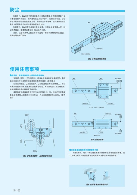 防尘MH系列、LWH系列的滑块虽然已经标准配备了侧面密封垫片及下面密封垫片来防尘,但大量垃圾或灰尘浮游时,或者诸如切屑、沙尘等较大的异物粘附在轨道面上时,彻底防尘非常困难,因此推荐用防尘罩或大行程多段式密封件等整体覆盖的方法。MH系列、LWH系列备有专用防尘罩。专用防尘罩安装方便,防尘效果显著。需要时请参照Ⅲ-26页后再订购。此外,还备有滑轨上面没有安装孔的下侧安装规格的滑轨(图3)。需要时请向IKO咨询。使用注意事项安装面、安装基准面及一般性的安装结构安装MH系列、LWH系列时,将滑轨及滑块的安装基准面B、D正滑轨确地对准工作台及底座的安装基准面进行固定。(参照图4)安装基准面B、D及安装面A、C已经过精密的研磨精加工。所以如果安装侧的机械、装置等的安装面也经过了高精度的加工并正确安装,就能够获得稳定的高精度直线运动。滑块的安装基准面是有面是正视滑轨上表面的图5)标记的相反的一侧。滑轨的安装基准标记,其上方的侧面(箭头方向)。(参照滑块安装用内螺纹下侧安装规格滑轨图3下侧安装规格滑轨滑块安装基准面DBD滑轨标记安装基准面标记标记法兰型、方块型、紧凑方块型BD安装基准面标记滑块横向安装型图5安装基准面B图4安装基准面及一般性的安装结构安装基准面的肩高和角部圆弧半径如图6所示,对方一侧安装基准面的角部形状推荐设置清角槽。表17所示为对方一侧安装基准面的肩高和角部圆弧半径推荐值。图6安装基准面的角部形状CAⅡ-105