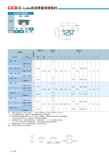 CC0TXT0TY4.82426.8548H197971081081314NW2W3W4L1L2L3L4d1H2H3319072952910811380.6123139106.614933100829629131012386.2135151114163147103.415810.7601037.512010010801115131314190146.62011.281.691.792.353.174.34法兰型下侧安装MH、LWH形状大小尺寸1535204525553065自由组合○○○————○○○○——○○○○——○○公称型号MH系列LWH系列(无C-Lube自润滑部件)MH30—MH30…M*MH30…MU*MHG30MH35——MHG35MH45——MHG45LWH30…BLWH30…SLLWH30…M*LWH30…MU*LWHG30LWH35…BLWH35…M*LWH35…MU*LWHG35LWH45…BLWH45…M*LWH45…MU*LWHG45脂嘴(5)H3W2W3W4H2HNWH1质量(参考)装配尺寸mm滑块尺寸mm滑块kg滑轨kg/mHC-Lube自润滑直线导轨H注(1)(2)(3)(4)(5)备注滑轨长度L记载于Ⅱ-93页上的表2.1、Ⅱ-94页上的表2.2及Ⅱ-95页上的表2.3、表2.4中。有关安装螺栓的长度,请准备拧入滑轨的螺纹深度在h1以下的螺栓。附带的滑轨安装用螺栓是相当于JISB1176的内六角螺栓。不锈钢制直线导轨H附带不锈钢制螺栓。MH系列的成套产品及LWH…MU的形式不附带滑轨安装用螺栓。基本额定动负荷(C)、基本额定静负荷(C0)、额定静力矩(T0、TX、TY)为下图的方向的数值。TX、TY栏中上方值为使用1个滑块时的值,下方值为使用2个紧靠的滑块时的值。脂嘴的形状因大小而异。规格详情请参照Ⅱ-104页中的表16。公称型号末尾的*表示为准标准品。Ⅱ-109
