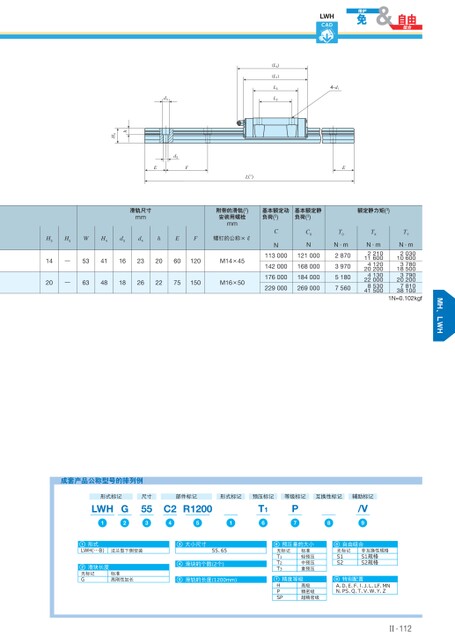 LWHCAD4-d1ET0N·m2870397051807560额定静力矩(3)TXN·m221011600412020200413022000853041500TYN·m2030106003780185003790202007810381001N≈0.102kgfH3H5WH4d3d4hEF螺钉的公称×R1420——534116232060120M14×45634818262275150M16×50附带的滑轨(2)安装用螺栓mm基本额定动负荷(3)基本额定静负荷(3)CNC0N113000121000142000168000176000184000229000269000(L4)(L1)L3L2L(1)d4d3EFhH4滑轨尺寸mm成套产品公称型号的排列例形式标记LWH1G2尺寸553部件标记形式标记预压标记等级标记互换性标记辅助标记C2R1200451T16P7/V98形式1LWH(⋯B)法兰型下侧安装3大小尺寸55、652滑块长度无标记G标准高刚性加长45滑块的个数(2个)滑轨的长度(1200mm)6预压量的大小8自由组合无标记T1T2T3标准轻预压中预压重预压精度等级7HPSP高级精密级超精密级无标记S1S2非互换性规格S1规格S2规格特别配置9A、D、E、F、Ⅰ、J、L、LF、MNN、PS、Q、T、V、W、Y、ZⅡ-112
