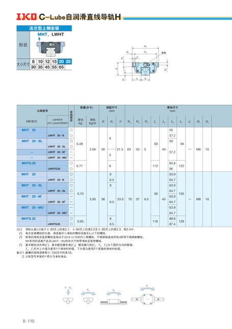 CC0TXT0TY质量(参考)装配尺寸mm滑块尺寸mm滑块kg滑轨kg/mHH1NW2W3W4L1L2L3L4d1M1H22.56303.50360.480.710.700.9365686.586.586.521.56353540831129523.570576.5451185657.25657.284.88663.964.763.964.763.964.763.964.786.687.494122105128—M610—M810自由组合○○○○——○○○○○○————○○公称型号MH系列LWH系列(无C-Lube自润滑部件)MHT20MHT20…SL——MHTG20MHT25MHT25…SLMHT25…M*MHT25…MU*MHTG25LWHT20…BLWHT20…SLLWHT20…M*LWHT20…MU*LWHTG20LWHT25…BLWHT25…SLLWHT25…M*LWHT25…MU*LWHTG25脂嘴H3W2W3d1W4H2NWH1H法兰型上侧安装MHT、LWHT形状大小尺寸830103512451555206525C-Lube自润滑直线导轨H滑轨长度L记载于Ⅱ-93页上的表2.1、Ⅱ-94页上的表2.2及Ⅱ-95页上的表2.3、表2.4中。有关安装螺栓的长度,请准备拧入滑轨的螺纹深度在h1以下的螺栓。附带的滑轨安装用螺栓是相当于JISB1176的内六角螺栓。不锈钢制直线导轨H附带不锈钢制螺栓。MH系列的成套产品及LWHT…MU的形式不附带滑轨安装用螺栓。注(1)(2)(3)(4)基本额定动负荷(C)、基本额定静负荷(C0)、额定静力矩(T0、TX、TY)为下图的方向的数值。TX、TY栏中上方值为使用1个滑块时的值,下方值为使用2个紧靠的滑块时的值。备注1.脂嘴的规格请参照Ⅱ-104页中的表16。2.公称型号末尾的*表示为准标准品。Ⅱ-115