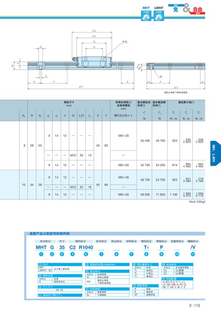 EL(1)高防尘滑轨下侧安装规格EEMFh2h1MHTCADLWHTCAD(L4)(L1)L3L24-M1L(1)滑轨尺寸mmd4d3EFhH4H3WH4d3d4hMh1(2)h2EF螺钉的公称×R91412———M8×28828254080———M122013—附带的滑轨(3)安装用螺栓mm基本额定动负荷(4)基本额定静负荷(4)额定静力矩(4)CNC0NT0TXTYN·mN·mN·m354004070062353628205362820991412———M8×284270053200814894446089444601412———103428———M1223164080M8×28—48700537008236313480579319091412———M8×285950071600110010905570100051101N≈0.102kgf成套产品公称型号的排列例部件标记形式标记防尘标记材料标记预压标记等级标记互换性标记辅助标记167T18P9/V1110滑轨的长度(1040mm)8预压量的大小10自由组合C2R10404556形式标记MHT1G2尺寸3531形式MHTLWHT(⋯B)法兰型上侧安装2滑块长度无标记G标准高刚性加长3大小尺寸30、354滑块的个数(2个)防尘标记无标记MMU标准规格高防尘规格高防尘滑轨下侧安装规格7材料种类无标记SL碳素钢制不锈钢制无标记T1T2T3标准轻预压中预压重预压精度等级9HPSP高级精密级超精密级无标记S1S2非互换性规格S1规格S2规格特别配置11A、BS、D、E、F、Ⅰ、J、LLF、MA、MN、N、PS、QRE、T、UR、V、W、Y、ZⅡ-118