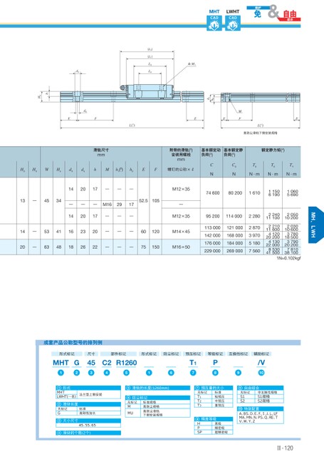 EL(1)高防尘滑轨下侧安装规格EEMFh2h1MHTCADLWHTCAD(L4)(L1)L3L24-M1附带的滑轨(3)安装用螺栓mm基本额定动负荷(4)基本额定静负荷(4)额定静力矩(4)CNC0NT0TXTYN·mN·mN·mH3H5WH4d3d4hMh1(2)h2EF螺钉的公称×Rd3EFL(1)滑轨尺寸mmd4hH4142017———M12×3574600802001610115061901060569013—4534———M16291752.5105—142017———M12×359520011400022801420——5341162320———60120M14×456348182622———75150M16×5011300012100014200016800017600018400022900026900028703970518075602240111002050102002210116004120202004130220008530415002030106003780185003790202007810381001N≈0.102kgf成套产品公称型号的排列例部件标记形式标记防尘标记预压标记等级标记互换性标记辅助标记16T17P8/V109滑轨的长度(1260mm)7预压量的大小9自由组合形式标记MHT1G2尺寸4531形式MHTLWHT(⋯B)法兰型上侧安装2滑块长度无标记G标准高刚性加长3大小尺寸45、55、654滑块的个数(2个)C2R12604556防尘标记无标记MMU标准规格高防尘规格高防尘滑轨下侧安装规格无标记T1T2T3标准轻预压中预压重预压精度等级8HPSP高级精密级超精密级无标记S1S2非互换性规格S1规格S2规格特别配置10A、BS、D、E、F、Ⅰ、J、L、LFMA、MN、N、PS、Q、RE、TV、W、Y、ZⅡ-120